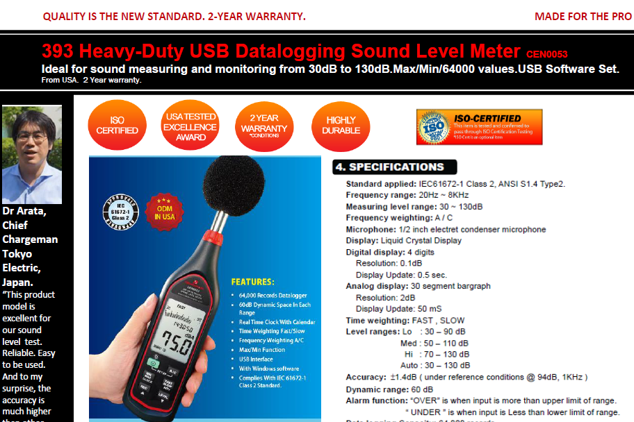 Featured item CEN0053-393 Heavy-Duty USB Datalogging Sound Level Meter-USA