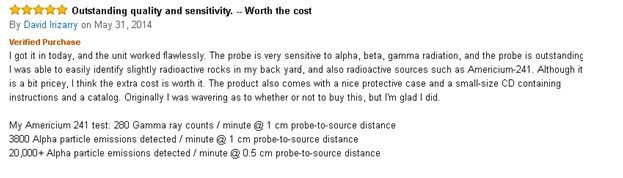 Radiation detectors can detect a broad range of ionizing alpha and beta particles, and gamma and x-rays that may be emitting harmful levels of radiation. They sense ionizing radiation with an enclosed Geiger Mueller (GM) tube to count radiation particles or rays. Alpha and beta particles are measured in counts per minute (CPM) or counts per second (CPS). Gamma rays and x-rays are measured in milliRoentgens (mR) per hour, microSieverts (μSv) per hour, or milliSieverts (mSv) per hour. Alpha particles are positively charged and heavier than beta particles, and have a limited range of approximately 3 to 5 centimeters by air. Alpha particles can be shielded by objects such as paper and unopened skin. High-energy beta particles are electrons, heavier than gamma rays, and can take either a positive or negative charge. Beta particles can be shielded by aluminum or wood. High-frequency (short wavelength) gamma rays are the strongest and lightest rays. Gamma rays are more penetrating than alpha and beta particles. They can be shielded by dense materials such as lead, and large masses of concrete, hardened steel, or water. X-rays are man-made gamma rays, and have essentially the same properties and function. Radiation detectors commonly have either an analog or a digital display. Analog radiation detectors output with a needle-point scale, and digital units generate a numerical LCD digit display. Radiation detectors are commonly used by hobbyists for safety detection and rock inspection, and professionals in the in the nuclear, medical, mining, instructional, and research industries.
